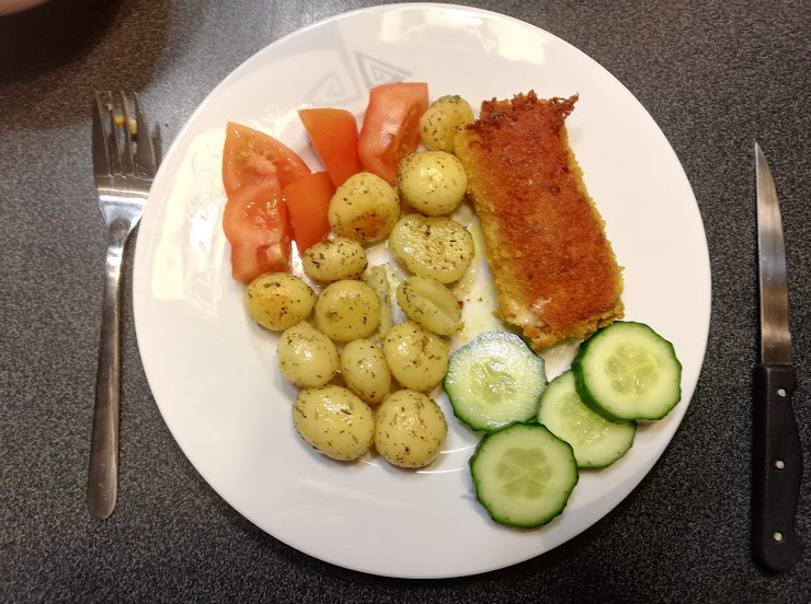 This evening my dad cooked cordon blue, potatoes, cumbumber and tomatoes. Before I ate I ate chips, because it’s not every day friday π.