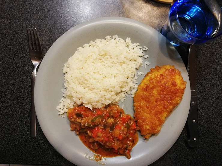This evening I ate rice with ratatouille and chicken with a crispy crust. My mom made the ratatouille. In the ratatouille there were aubergines, tomatoes, chilipeppers πΆ and bell peppers.