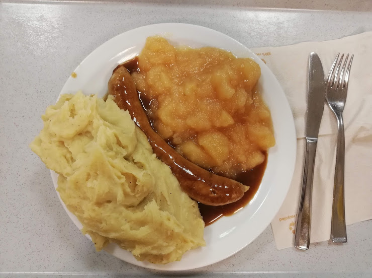 Tuesday noon I always eat a hot meal at school. This noon you could chose between fishπ and sausage, I prefer sausage to fish. As starch there were mashed potatoes or potatoes. I really like mashed potatoes, that’s one thing of my favorite food. You also could chose between broccoli or applesauce. I chose applesauce.